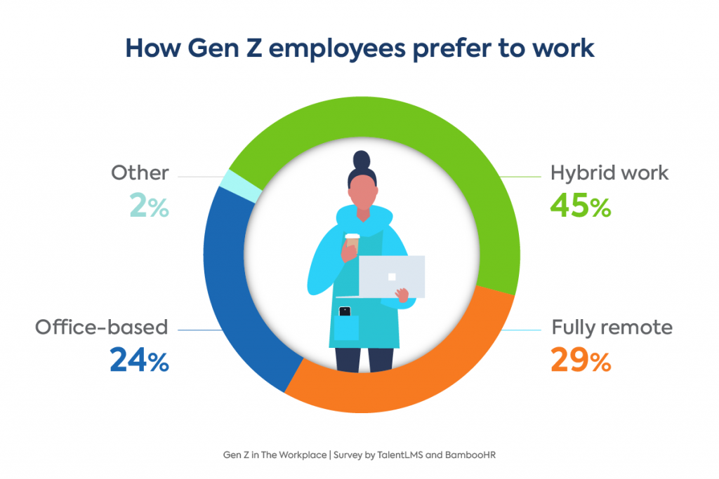 Flexibility in when and where they work is important for 81% of Gen Z employees. And the majority prefer a hybrid model, which combines remote and office work.