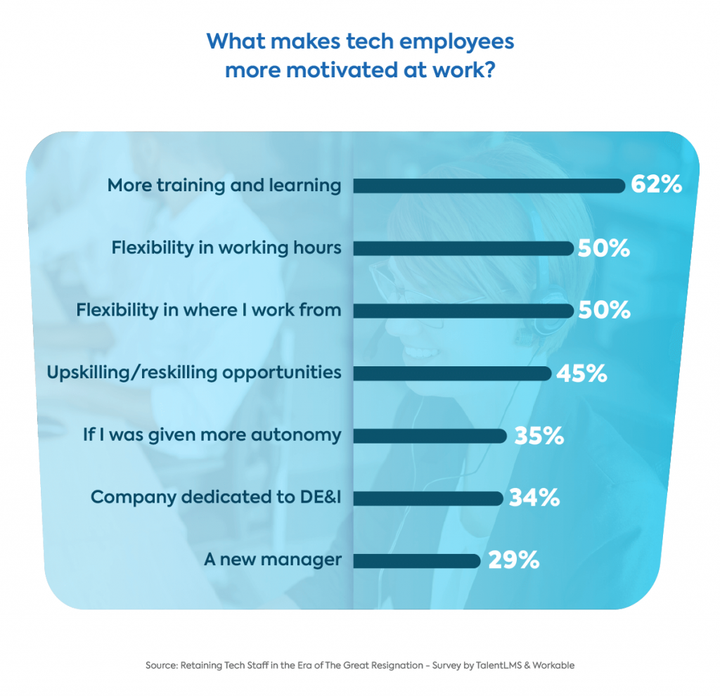 Tech employees seem to feel the same. Being offered more training and learning, as well as being able to work flexible hours, are the two main motivators among tech workers.
